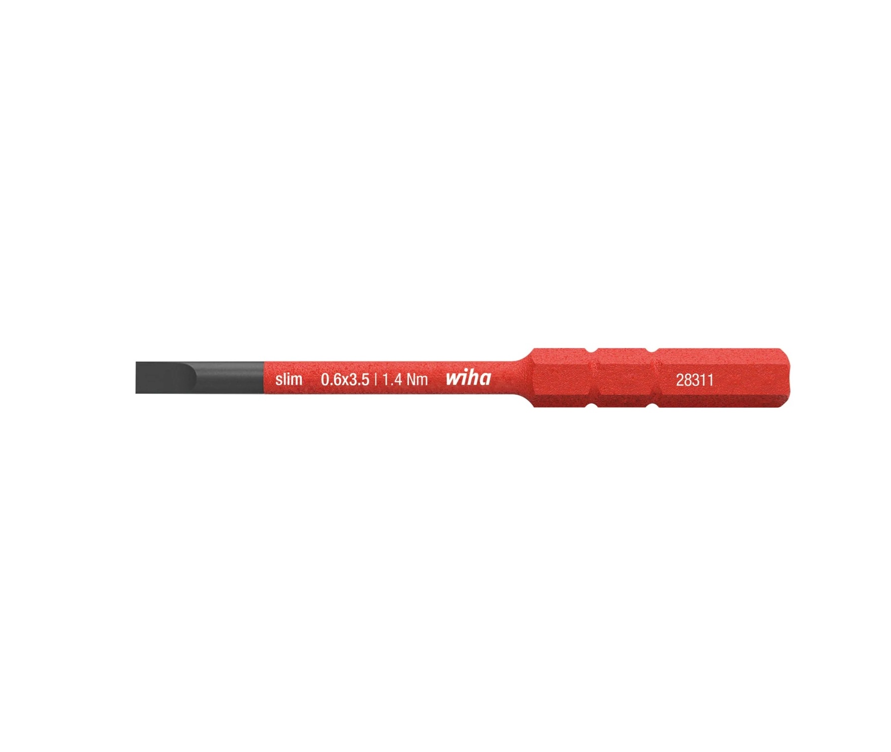 W konwencjonalnych wkrętakach dla elektryków, średnica trzonka jest często zbyt duża, aby dotrzeć do głęboko położonych śrub. Usuwanie izolacji z wkrętaka jest jednak zabronione i zagraża Twojemu bezpieczeństwu. Wkrętaki przeznaczone specjalnie dla elektryków, wykonane w technologii slimTECHNOLOGY opracowanej przez firmę Wiha, posiadają izolację ochronną zintegrowaną z trzonkiem, którego grubość jest zredukowana o 33%. Dzięki bitom slimBit mamy łatwy dostęp do głęboko położonych elementów śrubowych i sprężynowych. Izolowane bity slimBit poddawane są kontroli jednostkowej zgodnie z międzynarodową normą IEC 60900 i umożliwiają bezpieczną pracę w obszarze pod napięciem do 1000 V AC. Bity slimBits 6 mm należy stosować tylko w uchwytach slimVario® i slimTorque VDE (system dynamometryczny VDE).