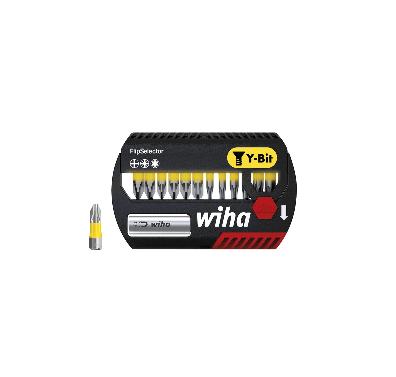 Dotychczas podczas zakupu bitów nie było całkiem jasne, jakie zastosowanie ma dany typ bitu. Firma Wiha położyła kres tej różnorodności stosowanych maszyn, połączeń śrubowych i dużego wyboru zróżnicowanych bitów. Dzięki rewolucyjnej koncepcji bitów firmy Wiha obecnie tylko kształt łba śruby odgrywa rolę podczas wyboru odpowiedniego bitu.Tym samym bit Y nadaje się idealnie do połączeń śrubowych wykonywanych za pomocą śrub z łbem Y-kształtnym o kącie różnym od 90° pomiędzy gwintem a łbem. Opatentowana, wydłużona strefa skrętna sprawia, że bit nadaje się również do wkrętarek udarowych, zapewniając 120x dłuższą żywotność w porównaniu do bitów standardowych firmy Wiha. Ponadto dzięki pokryciu lakierem luminescencyjnym można szybko i łatwo odnajdywać kolorowe bity nawet w ciemności przy użyciu lampy UV. Przez to zmniejsza się liczba zgubionych bitów, a tym samym można oszczędzić sobie niepotrzebnych kosztów przy kupowaniu nowych. Bity wraz z uchwytem na bity są rozmieszczone w zestawie FlipSelector w sposób przejrzysty i zwarty, dzięki czemu można je wyjmować łatwo i szybko.