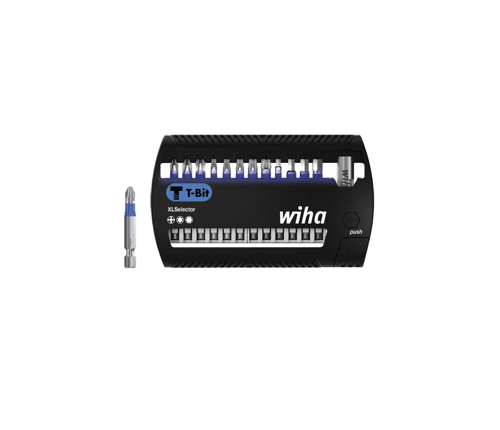Dotychczas podczas zakupu bitów nie było całkiem jasne, jakie zastosowanie ma dany typ bitu. Firma Wiha położyła kres tej różnorodności stosowanych maszyn, połączeń śrubowych i dużego wyboru zróżnicowanych bitów. Dzięki rewolucyjnej koncepcji bitów firmy Wiha obecnie tylko kształt łba śruby odgrywa rolę podczas wyboru odpowiedniego bitu.Tym samym bit T nadaje się idealnie do połączeń śrubowych wykonywanych za pomocą śrub z łbem T-kształtnym o kącie 90° pomiędzy gwintem a łbem. Opatentowana, wydłużona strefa skrętna sprawia, że bit nadaje się również do wkrętarek udarowych, zapewniając 120x dłuższą żywotność w porównaniu do bitów standardowych firmy Wiha. Ponadto dzięki pokryciu lakierem luminescencyjnym można szybko i łatwo odnajdywać kolorowe bity nawet w ciemności przy użyciu lampy UV. Przez to zmniejsza się liczba zgubionych bitów, a tym samym można oszczędzić sobie niepotrzebnych kosztów przy kupowaniu nowych. Bity wchodzące w skład zestawu XLSelector są rozmieszczone w sposób zwarty i niezajmujący wiele miejsca wraz z najpowszechniej stosowanymi odbiornikami napędu.