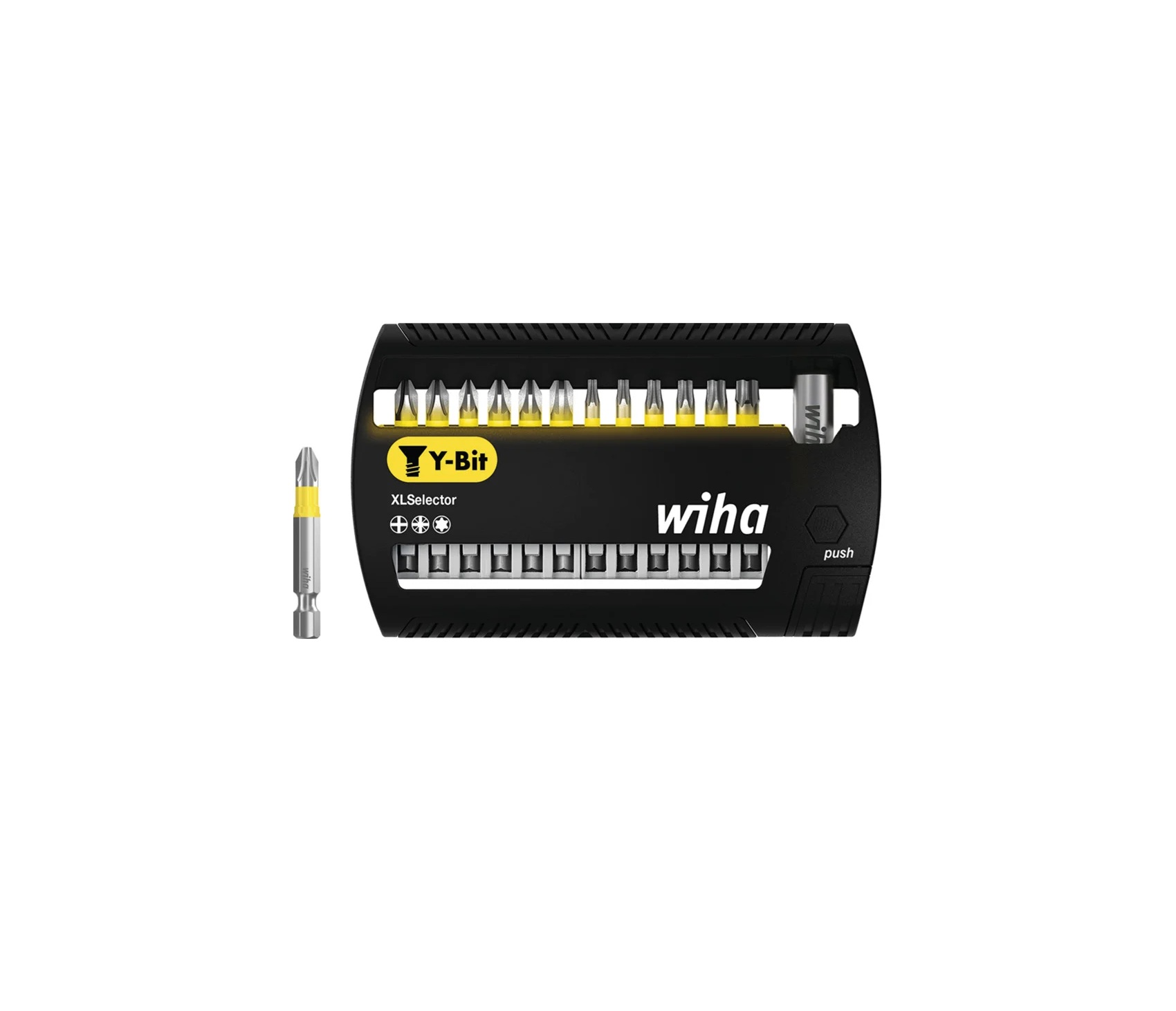 Dotychczas podczas zakupu bitów nie było całkiem jasne, jakie zastosowanie ma dany typ bitu. Firma Wiha położyła kres tej różnorodności stosowanych maszyn, połączeń śrubowych i dużego wyboru zróżnicowanych bitów. Dzięki rewolucyjnej koncepcji bitów firmy Wiha obecnie tylko kształt łba śruby odgrywa rolę podczas wyboru odpowiedniego bitu.Tym samym bit Y nadaje się idealnie do połączeń śrubowych wykonywanych za pomocą śrub z łbem Y-kształtnym o kącie różnym od 90° pomiędzy gwintem a łbem. Opatentowana, wydłużona strefa skrętna sprawia, że bit nadaje się również do wkrętarek udarowych, zapewniając 120x dłuższą żywotność w porównaniu do bitów standardowych firmy Wiha. Ponadto dzięki pokryciu lakierem luminescencyjnym można szybko i łatwo odnajdywać kolorowe bity nawet w ciemności przy użyciu lampy UV. Przez to zmniejsza się liczba zgubionych bitów, a tym samym można oszczędzić sobie niepotrzebnych kosztów przy kupowaniu nowych. Bity wchodzące w skład zestawu XLSelector są rozmieszczone w sposób zwarty i niezajmujący wiele miejsca wraz z najpowszechniej stosowanymi odbiornikami napędu.