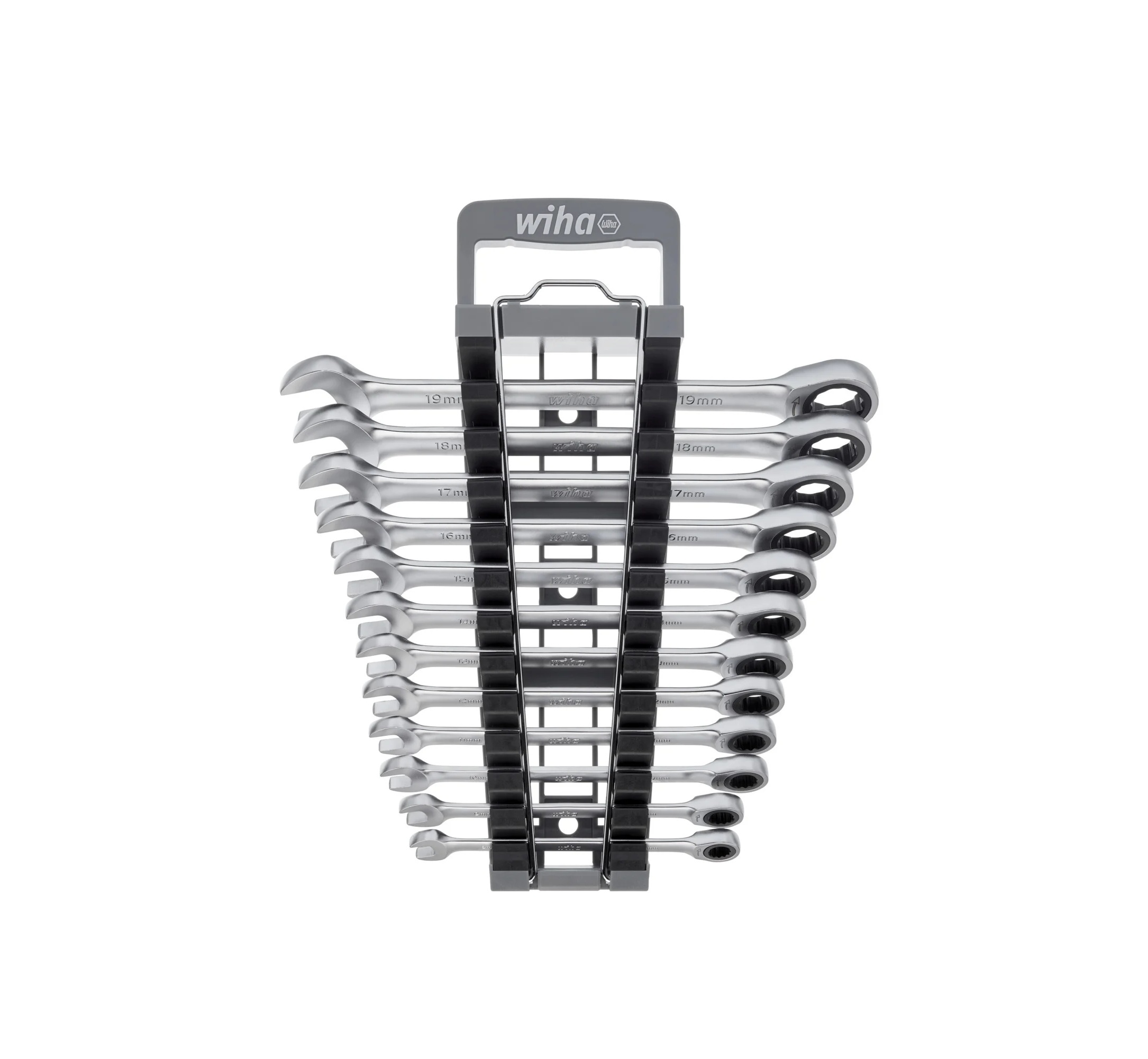 Dokręcanie, a także odkręcanie mocno dokręconych śrub i nakrętek sześciokątnych wymaga użycia ogromnej siły. Dzięki kluczom szczękowym z grzechotką oczkową Wiha użytkownik może skorzystać z zasady dźwigni, aby łatwo poluzować każde połączenie śrubowe. Ponadto końcówka szczękowa doskonale nadaje się do kontrowania śrub i nakrętek. Dzięki ułożeniu szczęki pod kątem 15° końcówka szczękowa idealnie nadaje się do prac w wąskich miejscach. Również przy pracach z użyciem grzechotki oczkowej użytkownik dzięki drobnemu uzębieniu z 72 zębami i sześciokątowi podwójnemu korzysta z krótkiego kąta powrotu i najwyższego komfortu podczas prac w wąskich miejscach. Poprzez prosty obrót wokół własnej osi można przy tym zmieniać kierunek obrotów: w prawo lub w lewo. Wyprodukowane z wysokiej jakości stali chromowo-wanadowej klucze szczękowe z grzechotką oczkową są trwałe i niezawodne, również dzięki odpornej na korozję i łatwej do czyszczenia powierzchni. Zestaw obejmuje 12 najczęściej używanych rozmiarów, od 8 do 19 mm, umieszczonych w praktycznym uchwycie. Uchwyt można otworzyć jedną ręką i łatwo wyjąć klucz w potrzebnym rozmiarze.Powierzchnia klucza zapobiega ślizganiu i zapewnia pewny chwyt nawet w kontakcie z olejem czy podczas pracy w mokrych warunkach.