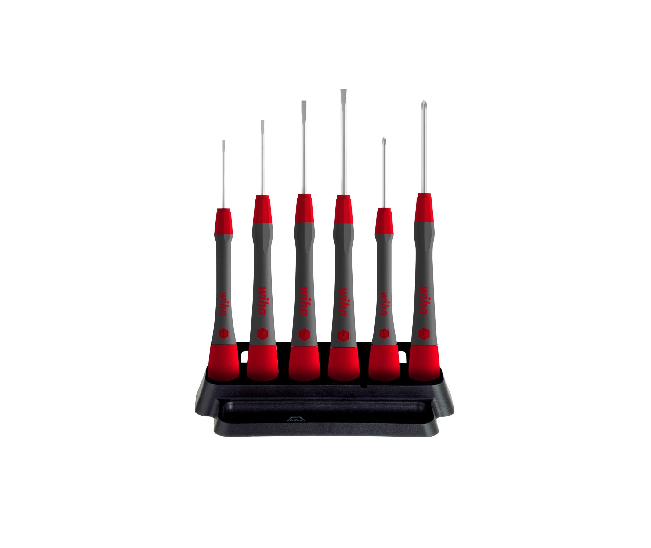 W przypadku połączeń śrubowych w mechanice precyzyjnej wyzwaniem jest praca z odpowiednim wyczuciem, tak by nie uszkodzić obrabianego elementu. Wkrętaki precyzyjne PicoFinish® firmy Wiha dzięki swoim długim, smukłym rękojeściom i strefie szybkiego obrotu nadają się idealnie do wykonywania precyzyjnych prac przy delikatnych elementach z dziedziny elektroniki i mechaniki precyzyjnej. Ergonomiczne wzornictwo rękojeści ze strefą miękką zapewnia komfort pracy. Pełne wyczucia i szybkie obracanie wspomagane jest przez kołpak obrotowy poruszający się bez oporu. Ponadto nadrukowane na kapturkach obrotowych wkrętaków symbole ułatwiają wybór wkrętaka o właściwym profilu. Zestaw zawiera 6 wkrętaków precyzyjnych PicoFinish® i uchwyt. W tym ostatnim można wygodnie przechowywać wkrętaki precyzyjne na stanowisku pracy.